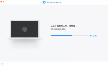 步骤3: 开始越狱iOS设备,设备与计算机连接成功后,越狱工具将立即开始下载(请确保网络状态良好)。1分钟左右,越狱工具将会下载完毕,点击“开始越狱”,然后越狱工具将开始越狱您的iPhone / iPad,按照指引操作进行即可。