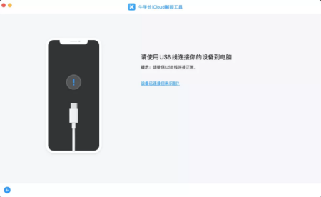 步骤2:使用数据线连接设备与Mac电脑,在继续下一步之前,请确保USB数据线已正确连接,同时仅连接此一台设备。(使用Mac进行解锁,基本实现一键操作,Windows电脑越狱过程较为繁琐,不推荐小白操作)