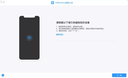 步骤1: 下载安装好此工具,即可看到 “移除iCloud激活锁”功能。工具将越狱您的设备,这可能会使您的设备变砖。在开始解锁iCloud帐户之前,软件会有一个风险提示,请仔细阅读。