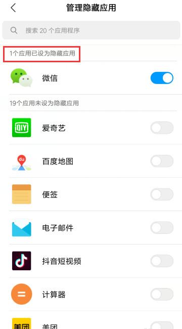 9、重新退出页面,再进入管理隐藏应用页面,就可以看到该应用已经设为隐藏应用了。