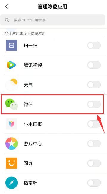 7、在管理隐藏应用页面,点击你要隐藏的应用,比如:微信。