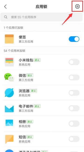 4、密码设置成功之后,进入应用锁页面,点击右上角的设置图标。