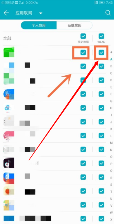 4、进入到应用联网界面之后,找到快手应用,应用的后面分别有两个方框,对应着移动数据权限和wifi权限,勾选连接WiFi即可。