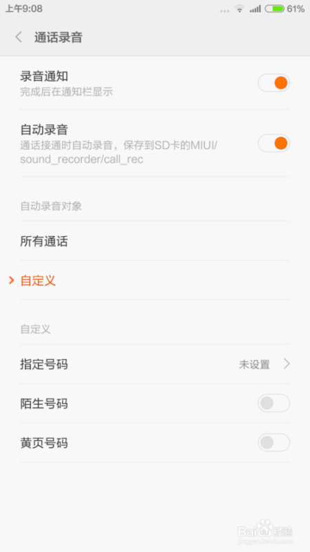 在电话设置界面第一个是通话录音设置,点击进入其设置界面,开启【自动录音】有两个自动录音选项可供选择,一个是【所有通话】另一个是【自定义】,我们一般选择【自定义】将你认为中要的联系人的通话记录下来,如果选择【所有通话】你手机的内存会很快满的。