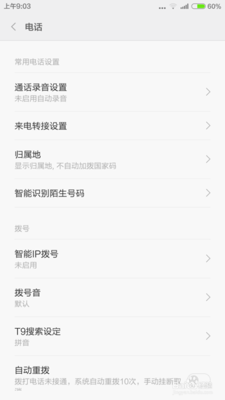 进入【拨号】界面后长按任务键(三横),接着页面跳转到电话设置界面,如图所示