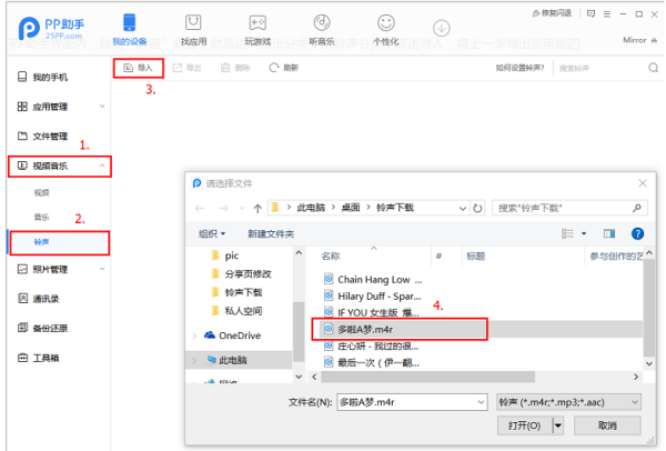 4、在PP助手界面内,找到“视频音乐”标签,然后进入视频音乐分类下的铃声分类,点击导入,将第一步下载的铃声导入至手机。
