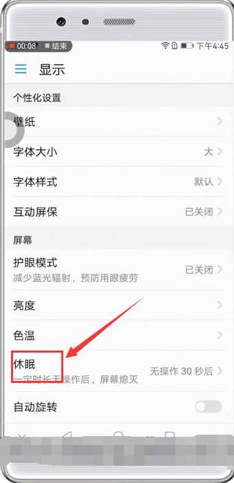 3、进入华为P10手机显示界面后,找到休眠,点击进入。