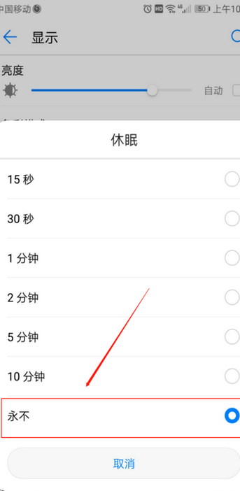 4、进入华为P10手机休眠界面后,选择永不,就去掉了手机锁屏时间了。