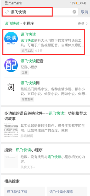 3、在小程序页面的搜索框输入【讯飞快读】进行搜索,在搜索结果中选择【讯飞快读】,点击进入。