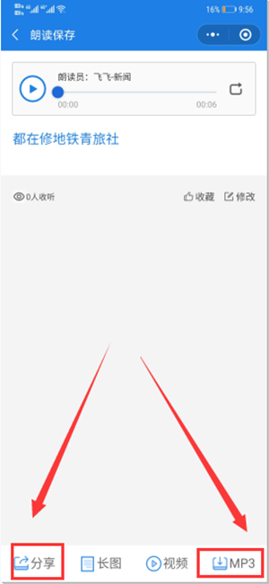 6、然后可以将这段语音朗读分享给微信好友或者保存成MP3下载到手机上。
