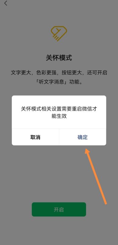4、打开【关怀模式】需要重启微信,我们点【确定】就可以了。