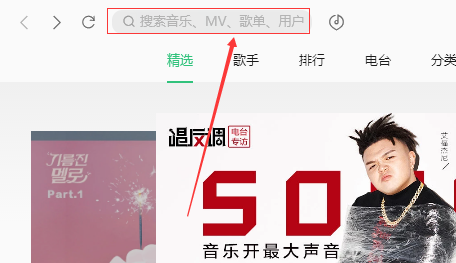 2、在打开的页面中,点击左上角的搜索,在上面输入你想下载的歌曲