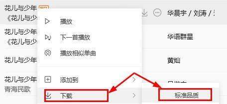 3、比如搜索“花儿与少年”,在下面选择一首点击鼠标右键,选择下载标准音质。