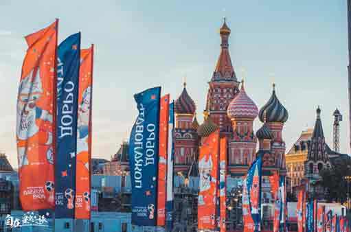 世界杯期间的莫斯科吸引了来自全世界的球迷游客,在球场之外也是一片热闹景象。在位于市中心著名的红场上,飘扬着的世界杯各色旗帜与古老的建筑相得益彰,让壮丽的红场更有生机活力。