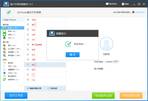 4:扫描结束之后,在界面左侧勾选要恢复的数据,随后点击“导出选中记录”按钮,软件就开始恢复操作了。