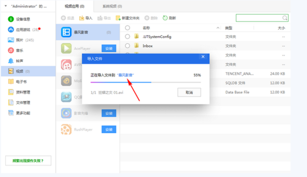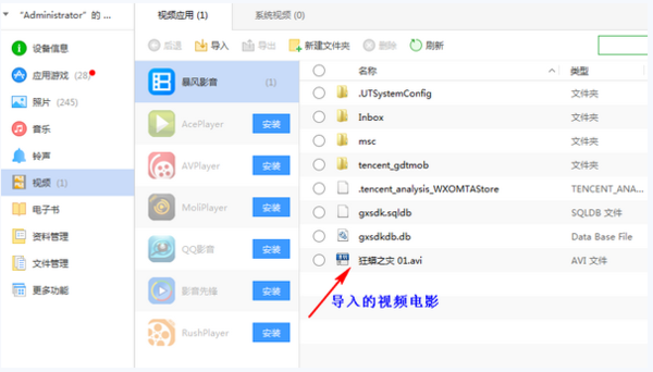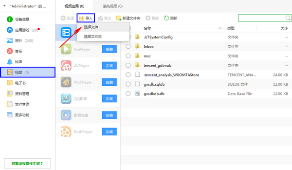 之后我们来把电脑上的电影视频导入到苹果手机里,直接点击左侧工具栏里的“视频”,你会看到你手机上安装了哪些播放器,如果没安装的话,建议选择一个进行安装,直接点击播放器旁边的“安装”就行了,安装播放器是为了播放视频电影的,安装好之后,会在左侧显示,然后点击“导入”—“选择文件”;“选择文件”是指选择一个视频文件,“选择文件夹”是指选择多个视频文件。