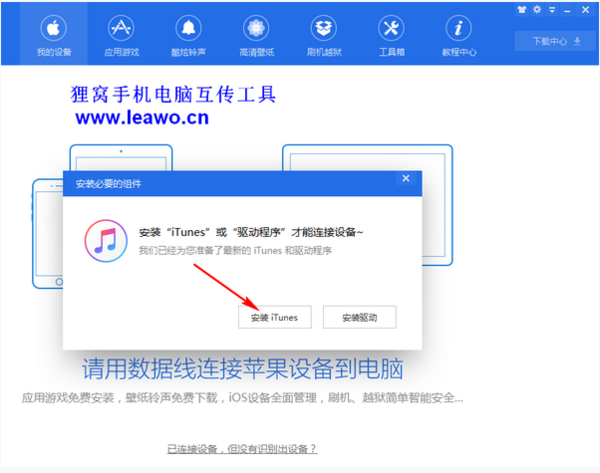 苹果手机要跟电脑连接并且进行资源的传输,一款手机电脑互传工具是少不了的,所有要想把电脑上的电影导入到苹果手机要先下载上述地址的软件。下载好该软件之后在电脑上进行安装(注意:这是针对苹果手机的),然后对其运行打开,这里会让你安装一个驱动跟程序,照着提示安装就好了,安装好后数据线连接手机跟电脑。
