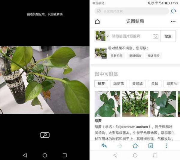 2.然后你只要把摄像头对准你要识别的植物,圈选自己感兴趣的区域,就可以轻松识别出植物的名字和品种啦~