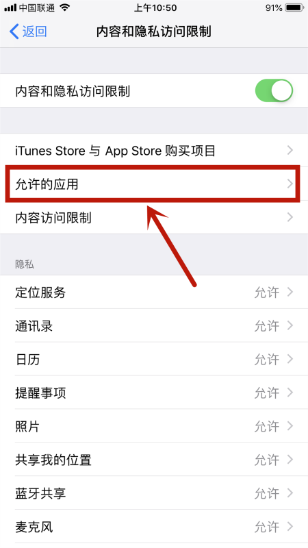 4、在【内容和隐私访问限制】页面下,点击【允许的应用】功能。