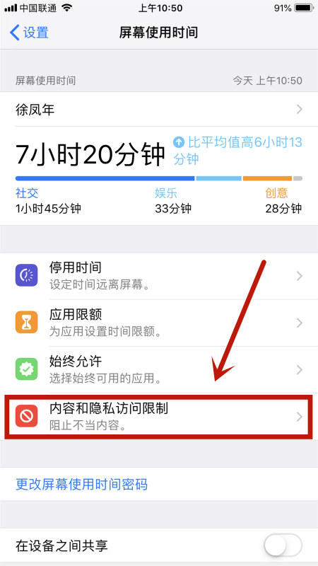 3、进入【屏幕使用时间】的管理设置页面下,点击【内容和隐私访问限制】功能继续。