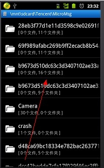 4、然后在页面中找到b9673d510dc63c3de407102ae33a (注意不同的手机,不同的微信账号,文件夹的名字不同,不过基本是这样一个文件串)点击这个文件。