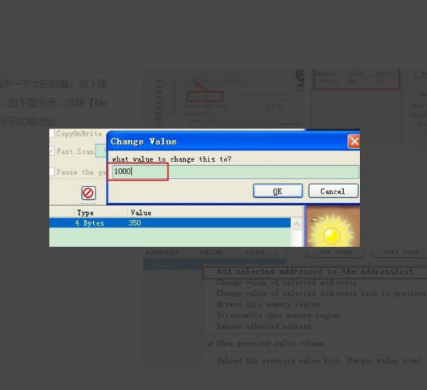 9、选中加载的地址栏目,双击【Value】弹出修改值1000。我们回到游戏,就可以发现太阳的数值为1000.这就表明你的数据修改成功了。