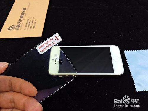 5、将钢化膜的背胶层保护膜揭掉,然后对准手机屏幕的孔位贴到手机屏幕上,如果膜的位置没有贴正,可以进行适当的调整,钢化膜就可以自动附在手机上了;