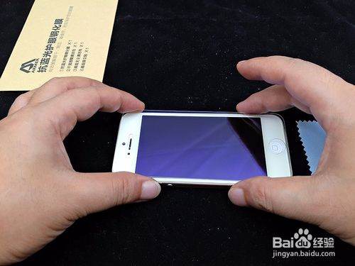 3、屏幕擦拭干净,撕掉贴有吸尘膜的一面,把保护膜对正贴在屏幕上,轻轻按压,挤出气泡。