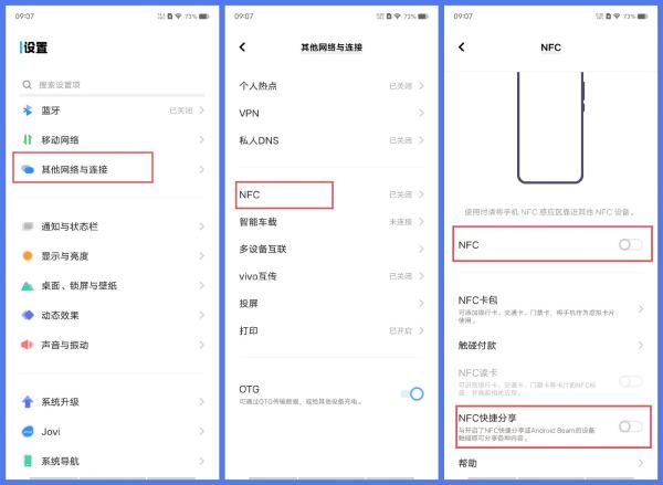 使用NFC投屏时,需手机和vivo Pad保持开启WiFi和蓝牙;同时手机需进入设置--其他网络与连接--NFC--开启“NFC快捷分享”,并保持亮屏状态,然后使用手机背部NFC区域碰触vivo Pad NFC区域(前置摄像头右上角),即可进行投屏。