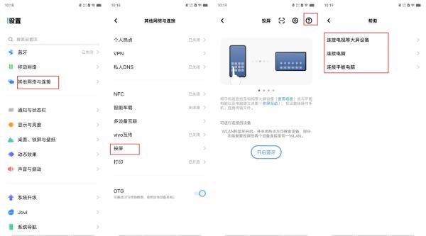 注:可进入手机设置--其他网络与连接--投屏--右上角“?”图标--帮助界面查看了解操作详情