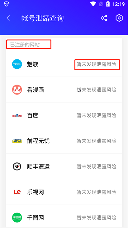 3、接着就可以看到手机号注册了哪些网站,有没有泄露风险。