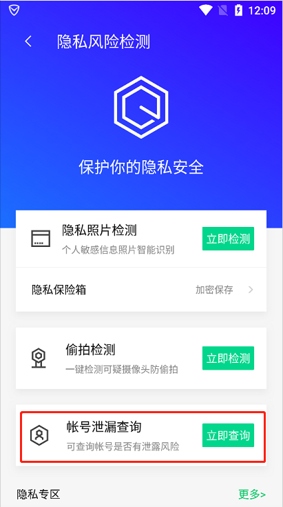 2、点击「账号泄露查询」。进入「账号泄露查询」界面,输入自己的常用手机号,然后获取验证码以确认是本人使用。
