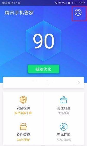1、打开手机管家,如果没有可以下载到手机,在手机管家主页右上角,有个人像的标志,手指点击一下。