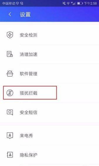 3、在“设置”页面找到用点击“骚扰拦截”的字样。