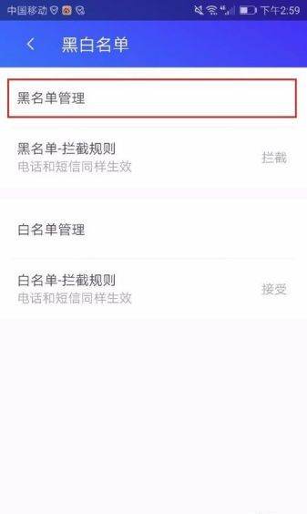 7、如果知道对方号码而不想接收短信,还可以设为黑名单,在“黑名单管理”中,添加对方进去,以后就不会收到对方信息了。