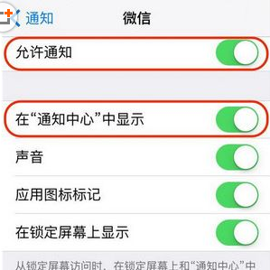 4、进入微信设置界面,将允许通知和在通知中心中显示处于开启状态即可。