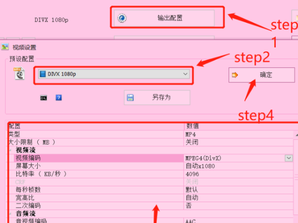 3、在“->MP4”转换子界面中,点击‘输出配置’按钮,进入配置子界面,首先在子界面上方选择输出的分辨率,然后根据需要对具体的视频流编解码参数进行设置,设置确定后点击确定退出。
