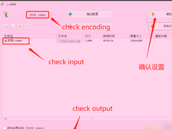 5、在“->MP4”转换子界面中,依次检查输入的文件、编解码设置以及输出配置,检查确定后点击界面中的“确定”按钮,确认当前的配置并返回软件主界面。