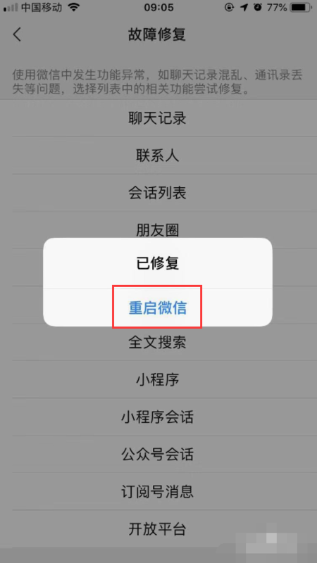 9、随后,会跳出对话框显示【已修复】,然后选择【重启微信】,如下图所示。