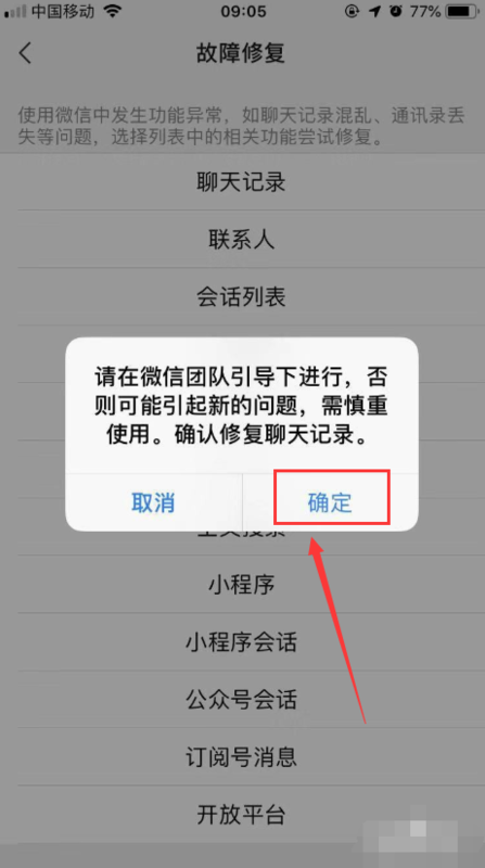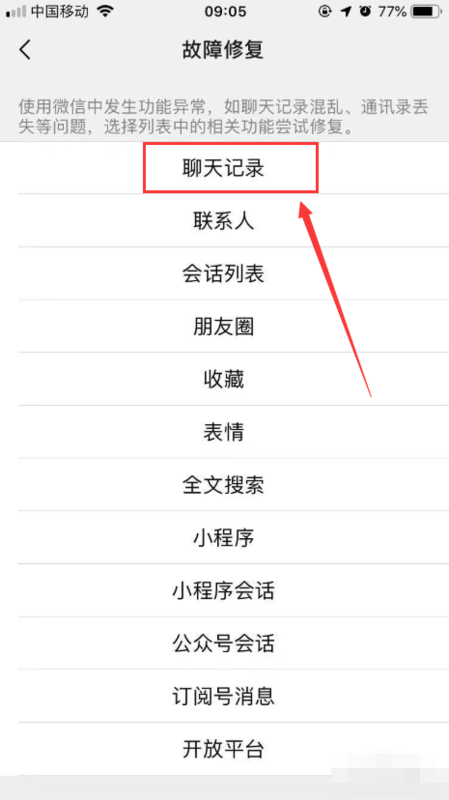 7、然后,在跳出的故障修复界面中,选择【聊天记录】选项,如下图所示。
