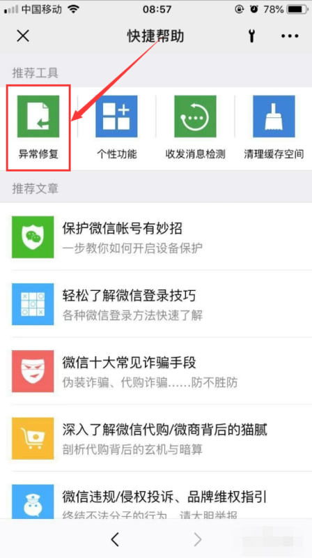 5、进入【快捷帮助】界面后,选择【异常修复】选项,如下图所示。