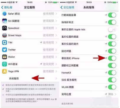 2、前提是需要在「设置—隐私—定位服务—系统服务—查找我的iPhone」中打开服务。