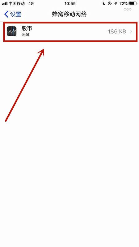 3、打开蜂窝移动网络界面之后,选择无法使用无限网络打开的应用程序,这里以“股市”应用程序为例,如下图所示。