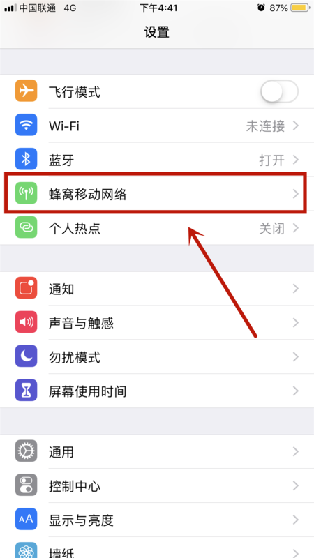 2、打开设置界面之后,选择点击“蜂窝移动网络”选项,如下图所示。