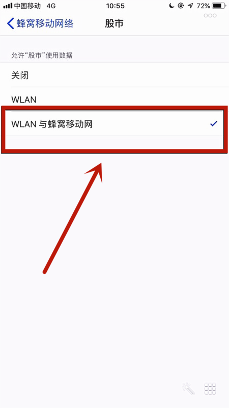 4、最后进入股市的网络权限界面中,将权限更改为“WLAN与蜂窝移动网”后即可。