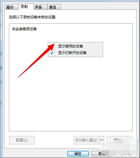5、进入录制界面,如果没有看到麦克风选项,说明我们的麦克风被禁用,右键点击勾选【显示已禁用设备】。