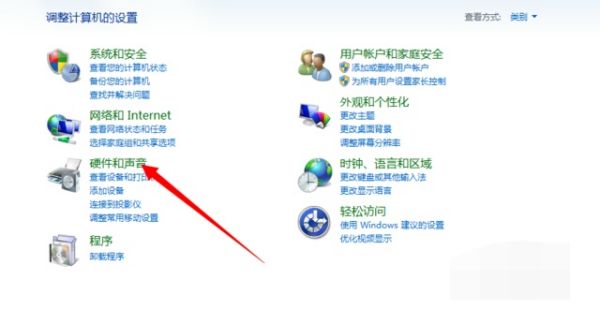 2、进入控制面板界面找到【硬件和声音】选项,点击打开。