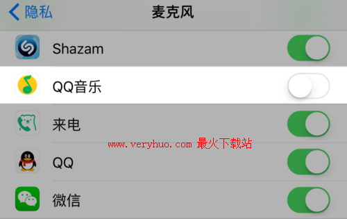 4、在麦克风的权限设置里,就可以管理哪些应用可以使用麦克风了,比如:QQ音乐没有打开,可根据需要启用。