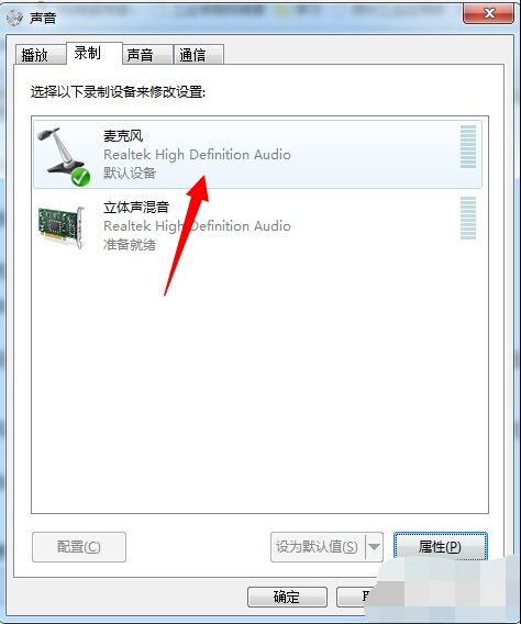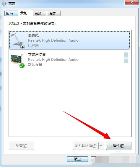 6、此时可以看到被麦克风已经显示,但是被禁用了,我们选中麦克风,然后点击下方【属性】选项。