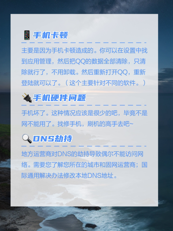 地方运营商对DNS的劫持导致偶尔不能访问网络。需要您了解您所在的城市和固网运营商;国际通用解决办法修改本地DNS地址。